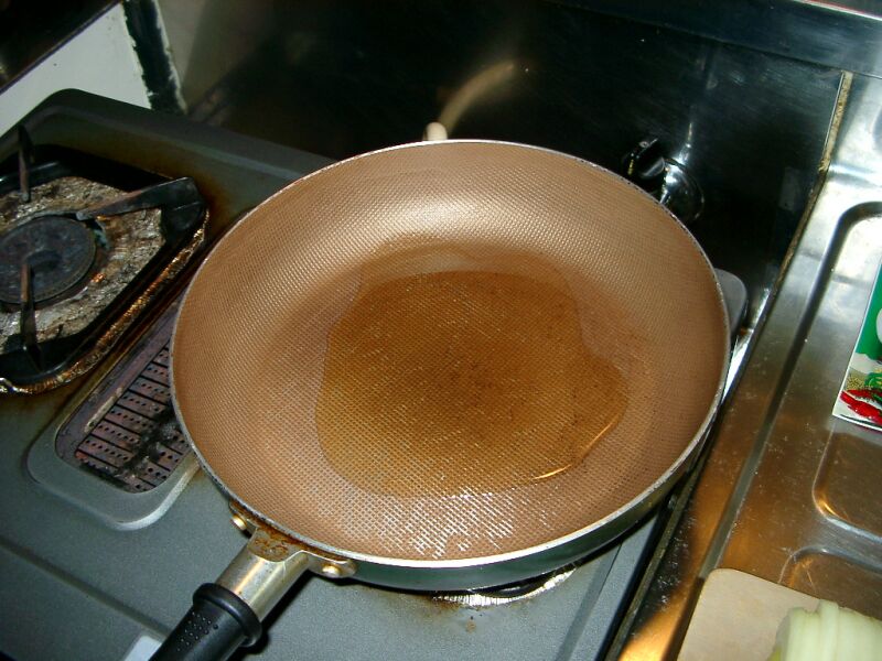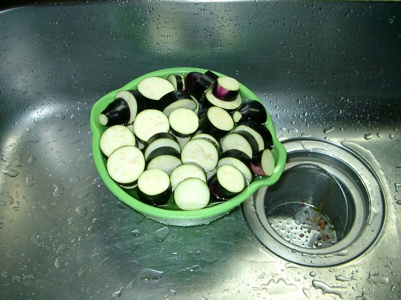 - 茄子は蔕を切断廃棄後、二糎厚の輪切。水に晒して灰汁抜き。